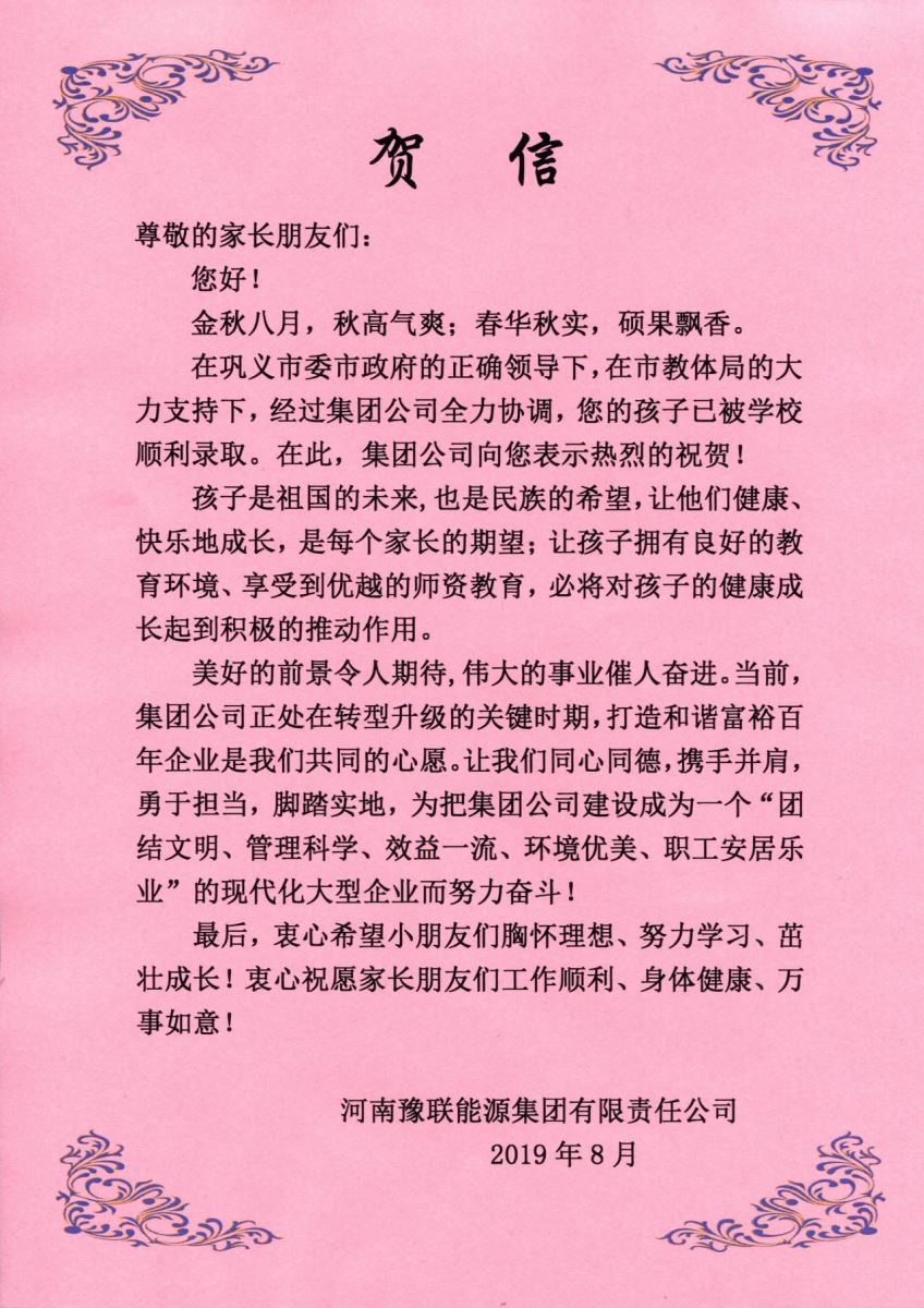 快開學(xué)了,最近幾天,豫聯(lián)集團(tuán)辦公室工作人員將從學(xué)校領(lǐng)回來的錄取通知書,連同公司的賀信,一并發(fā)給員工。和往年一樣,公司今年所有符合條件的員工適齡子女入學(xué)均得到妥善安排。