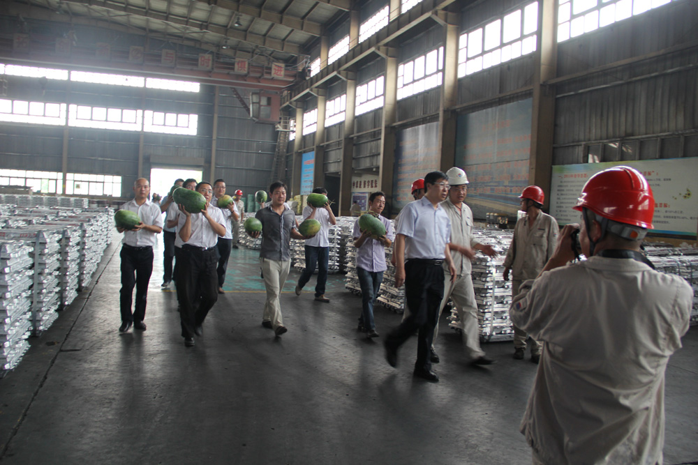 7月29日下午,受集團(tuán)公司張洪恩董事長(zhǎng)委托,薄廣利副總經(jīng)理帶領(lǐng)機(jī)關(guān)各職能部門(mén)人員20余人,先后到電力公司4號(hào)機(jī)組檢修現(xiàn)場(chǎng)、鋁業(yè)公司電解一分廠(chǎng)、銀湖合金鑄造車(chē)間和鋁灰處理車(chē)間、炭素公司焙燒一車(chē)間、高精鋁公司熔鑄車(chē)間參觀(guān)學(xué)習(xí),帶去西瓜、藿香正氣水、人丹、風(fēng)油精等防暑降溫用品,看望、慰問(wèn)奮戰(zhàn)在高溫崗位的一線(xiàn)員工。
