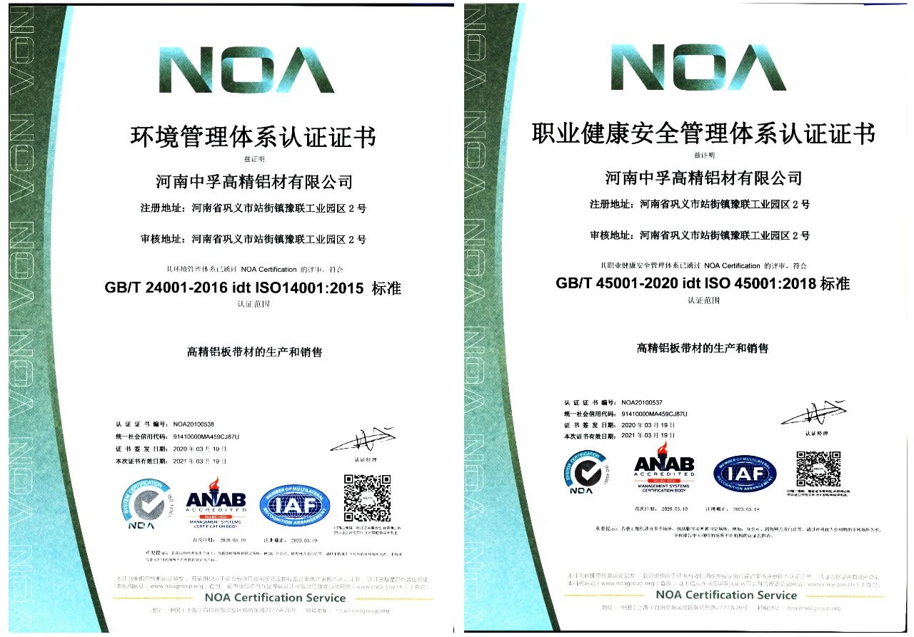 中孚高精鋁材公司獲得環(huán)境/職業(yè)健康安全管理體系認(rèn)證證書